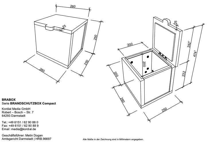 Die BRABOX-S ist die ideale Lösung zur brandsicheren Aufbewahrung von Festplatten, USB-Sticks und kleinen elektronischen Geräten. Kompakt, robust und für den täglichen Einsatz im Büro oder Gewerbe ausgelegt.